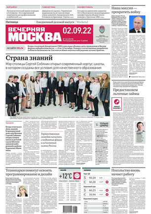 «Вечерняя Москва» — ежедневная российская вечерняя газета, старейшее из вечерних изданий в России, учрежденное в 1923 году. Выходит пять дней в неделю, кроме субботы и воскресенья. Отличается тем, что рассказывает о событиях еще не завершившегося дня. Оперативно освещает хронику и особенности жизни Москвы, охватывает все слои общества и большинство профессиональных и возрастных групп читателей.Издание представлено тремя выпусками – утренним ежедневным, вечерним (выходит три раза в неделю), еженедельным (выходит по четвергам).